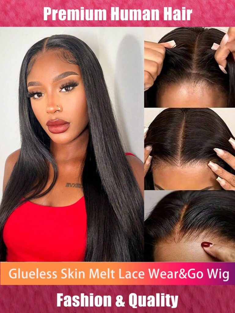 Perruque lace front sans colle, lisse et soyeuse, cheveux humains Remy. Prête à porter avec lace closure 4×4. Couleur noire naturelle. Perruque avec lace closure pré-coupée et pré-épilée, ligne de cheveux fondue, droite et soyeuse. Facile pour les débutants. Pour femmes.