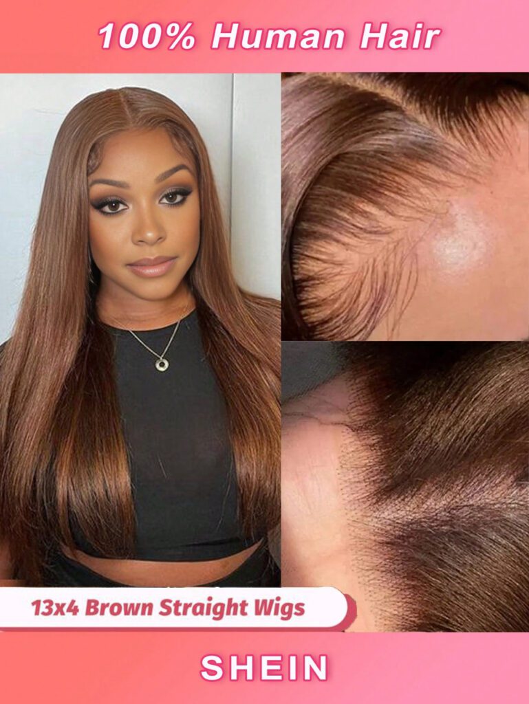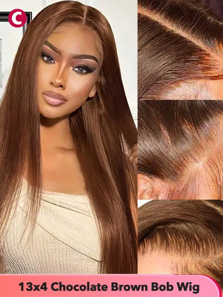 Perruques cheveux humains à la coupe droite avec dentelle transparente sur le devant, couleur marron chocolat, densité de 180%, prépluchées avec des cheveux bébé. Convient aux femmes.