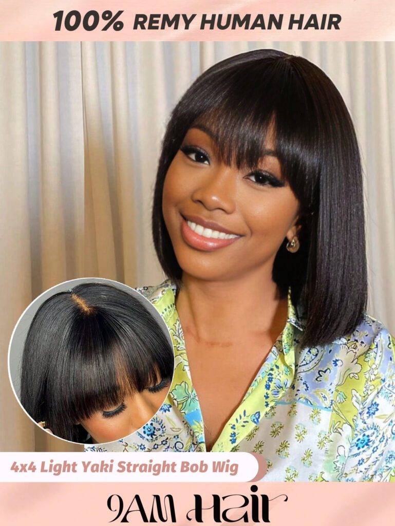 Perruques En Cheveux Humains Yaki Straight Bob 4×4 Fermeture À Lacets Perruque Courte En Cheveux Humains Avec Frange