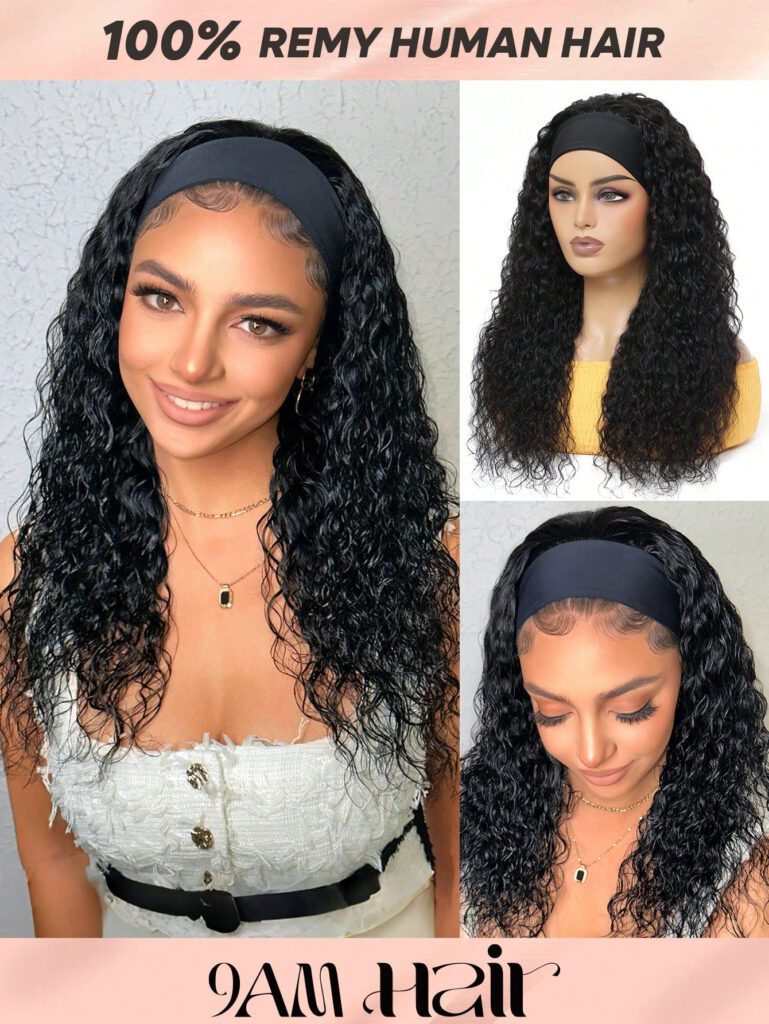 Perruque en vague d’eau avec bandeau, couleur noir naturel, cheveux vierges brésiliens non traités, fabriqué à la machine, perruque facile à porter, densité 130% 150% 180%