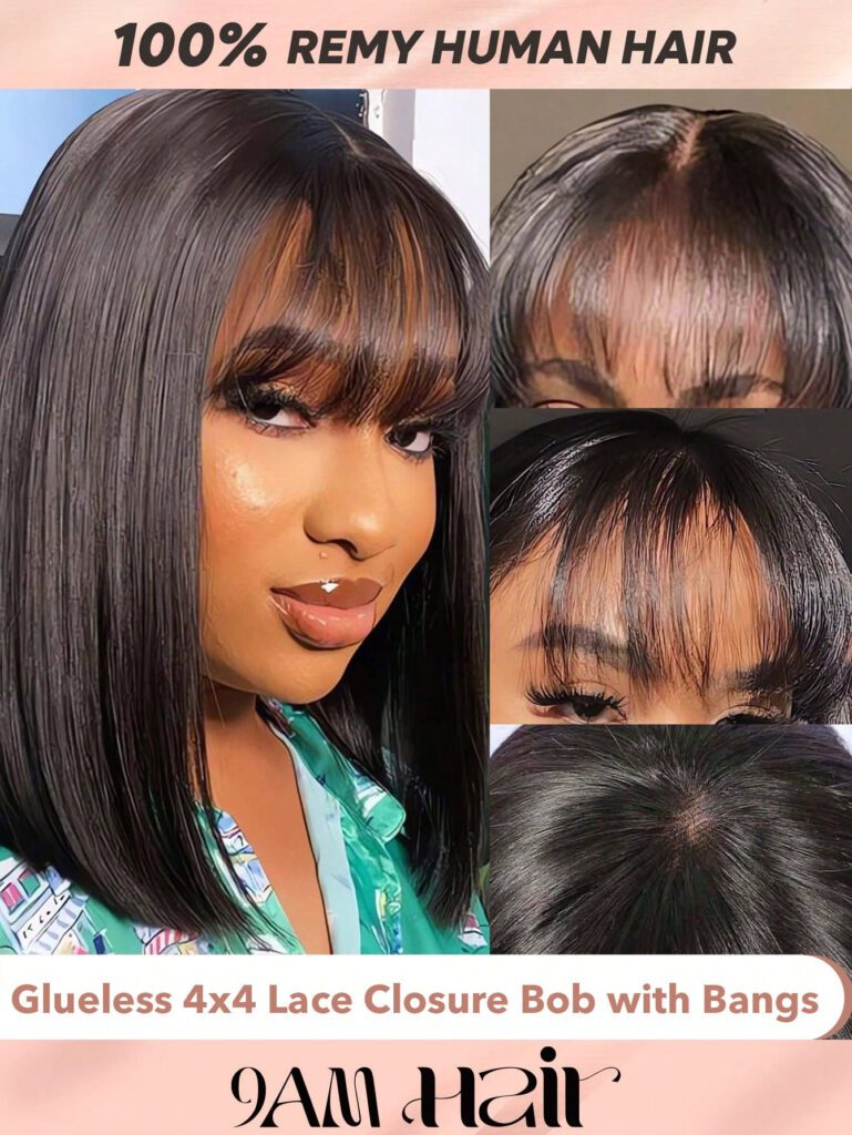 Perruque lace front sans colle, lisse et soyeuse, cheveux humains Remy. Prête à porter avec lace closure 4×4. Couleur noire naturelle. Perruque avec lace closure pré-coupée et pré-épilée, ligne de cheveux fondue, droite et soyeuse. Facile pour les débutants. Pour femmes.