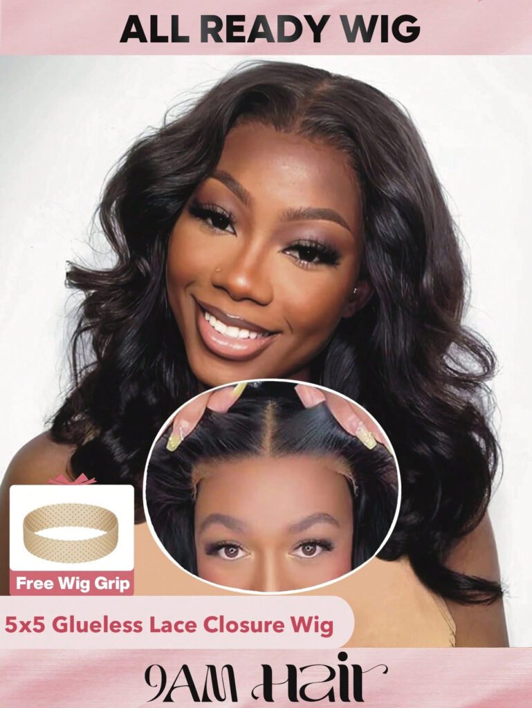 ALL READY WIG Perruque à fermeture en dentelle sans colle 5×5 en cheveux 100% humains en vague de corps, pré-décolorée, pré-épilée et pré-coupée, dentelle fondante 9AM HAIR