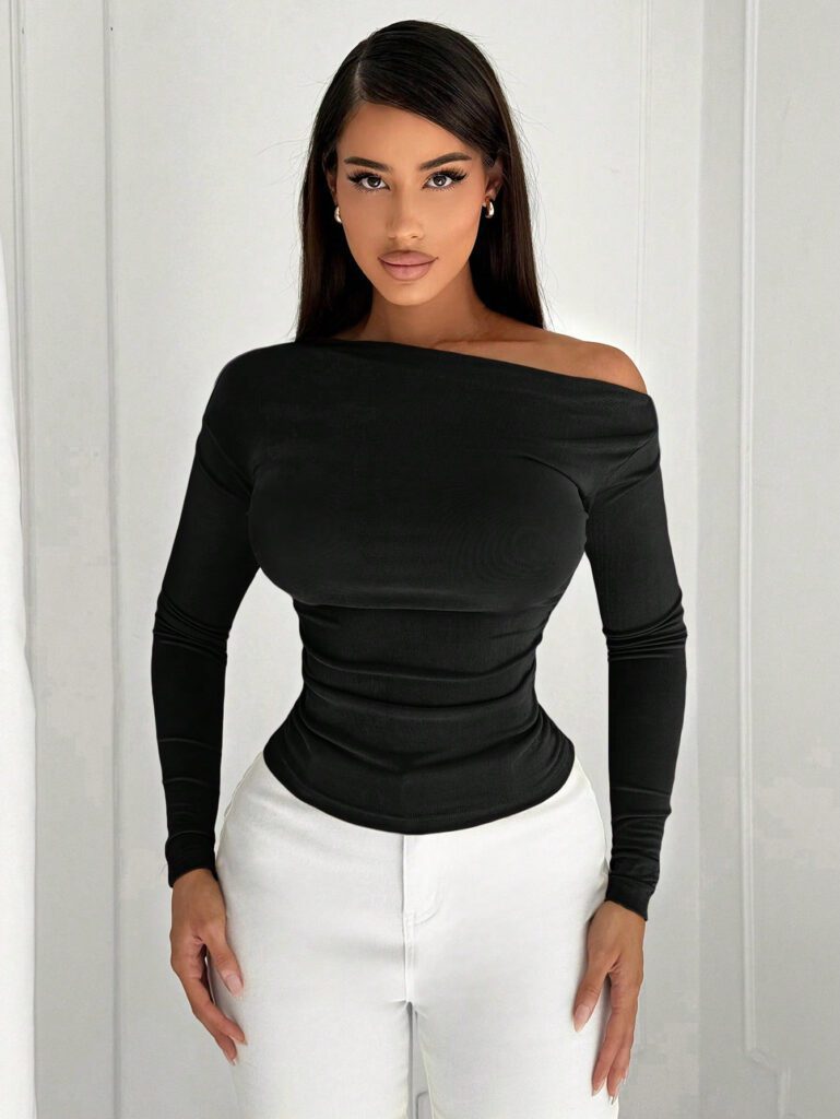 SHEIN Raffinéa T-shirt unicolore à ruché à col asymétrique