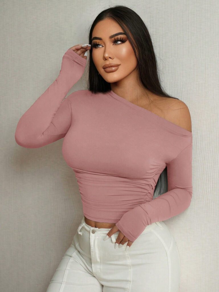 Aloruh Tee-shirt minimaliste à manches longues et froncis à l'épaule découverte, convient pour les sorties casual