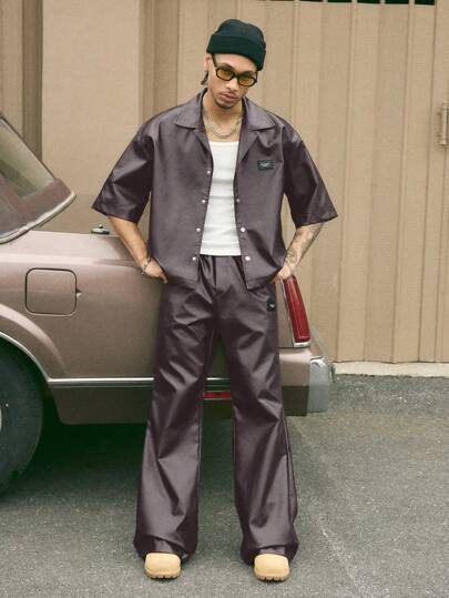 AXEPEAK Ensemble chemise à manches courtes ample et short en PU pour hommes, style été, streetwear