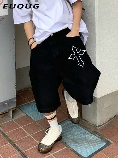 Short en jean ample et décontracté pour homme avec poche à patch imprimé croix