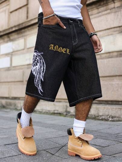 Manfinity EMRG Shorts homme gothiques style rue lâche, noirs lavés avec broderie