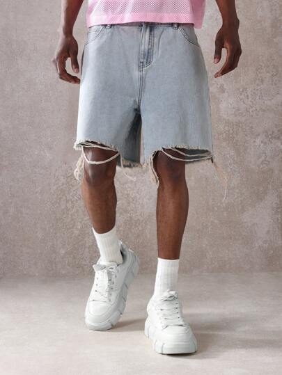 Manfinity Denimwave Short en jean délavé bleu clair vintage, style casual droit pour hommes, style emo