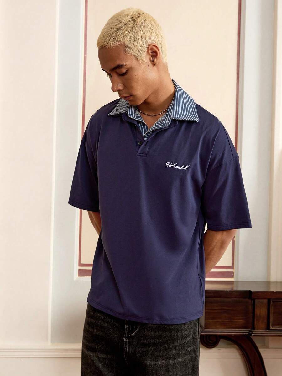 SWAVVY Chemise polo décontractée de mode pour homme, 2 en 1, col bicolore, fleur brodée, logo anglais, ample