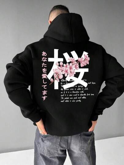 Sweat-shirt à capuche à cordon de serrage avec poche, manches longues, style japonais graphique, décontracté pour homme