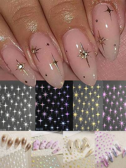 1/4 pièces Autocollants d’ongles avec explosion d’étoiles dorées au laser, décalcomanies d’art nail manucure française en métal, autocollants de décoration d’ongles en forme d’étoile à quatre branches avec dos adhésif
