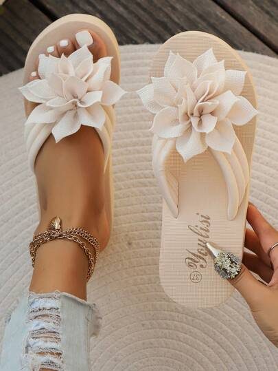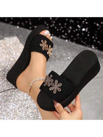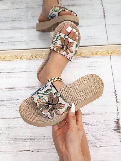 Sandales compensées pour femmes avec semelle épaisse, décor de fleurs à la mode, pantoufles confortables pour la maison, légères et décontractées pour la plage