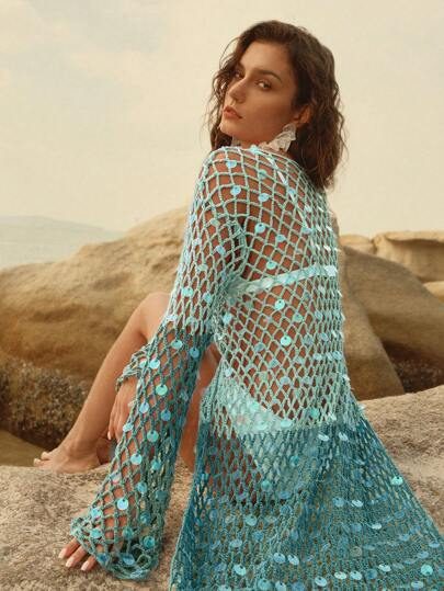 Anewsta Kimono cache-maillot ajourée séquinée pour femmes, idéal pour les vacances d’été à la plage