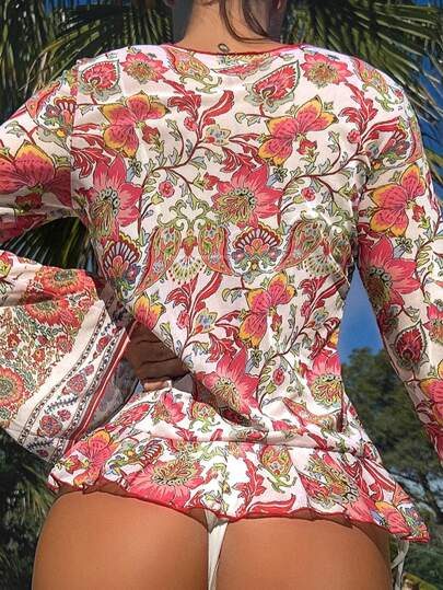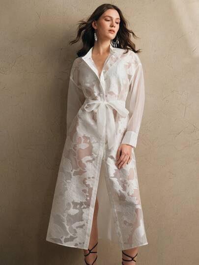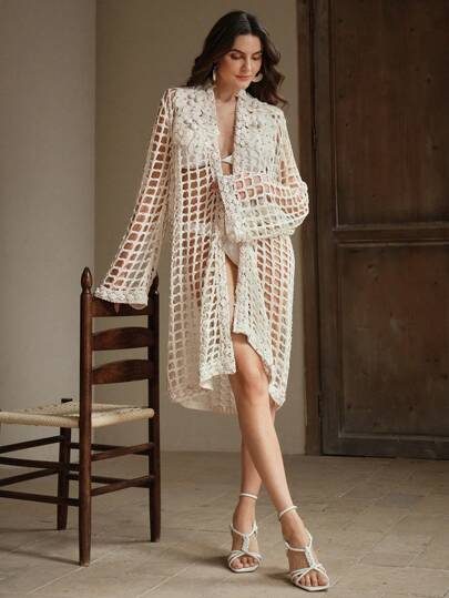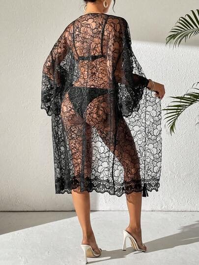 SHEIN Swim Femmes Kimono Transparente à Manches Longues de Couleur Unie Longue Robe d’été