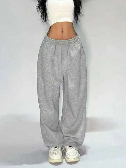 SHEIN PETITE Nouveau pantalon de survêtement ample en velours épais et chaud pour l’automne/hiver, à taille élastique basse, jambes larges et détente