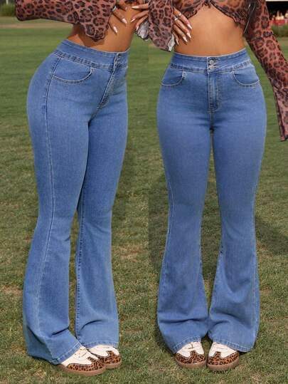 SHEIN EZwear Jeans évasés en denim stretch décontractés pour femmes, bleu