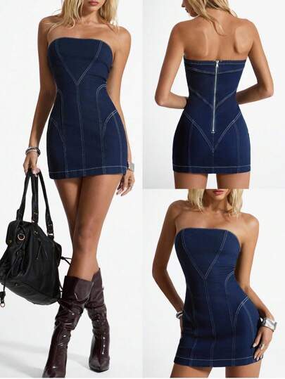 Jeanoix Robe moulante en jean à fermeture éclair au dos pour femmes, style mode
