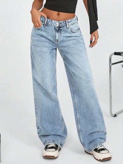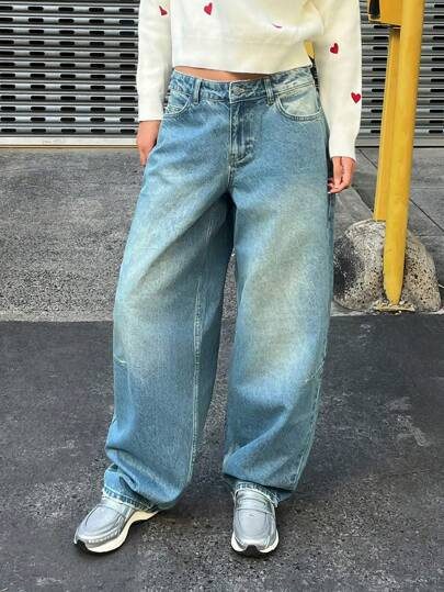 SHEIN Jean ample à taille basse avec poches inclinées et effet délavé