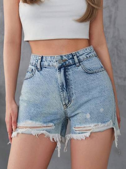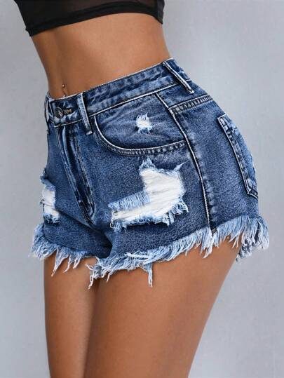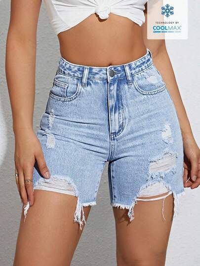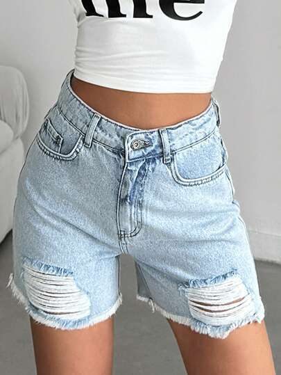 SHEIN EZwear Shorts en jean déchirés, coupe ajustée et décontractée pour l’été avec ourlet effrangé