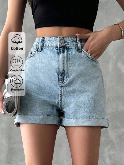 SHEIN PETITE Short en jean décontracté pour femmes avec poches et bas effiloché