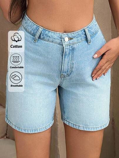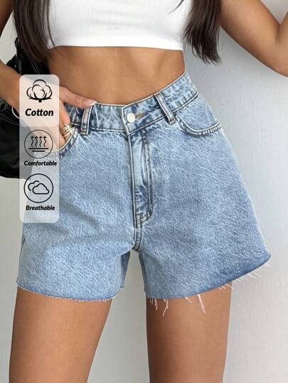 SHEIN Short en jean ample, décontracté, taille haute avec poches et ourlet à franges pour femmes