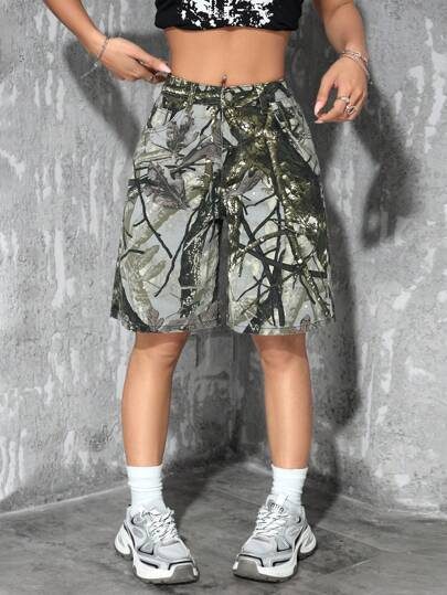 SHEIN EZwear Short en jean ample avec poches et motif de branches pour femme