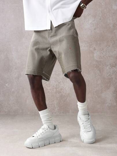 SUMWON Short en jean délavé style vintage pour charpentier, coupe décontractée, ourlet brut, coupe ample, détail éclaboussures de peinture. Tenue de fête et de rue décontractée.