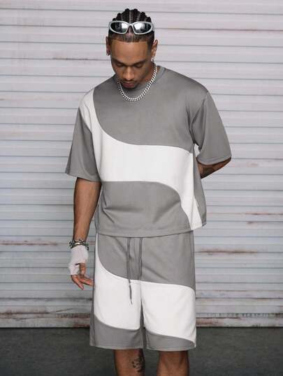 AXEPEAK Ensemble t-shirt d’été décontracté ample à épaules tombantes et shorts de couleur contrastée pour hommes