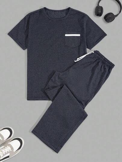 SHEIN Ensemble t-shirt et pantalon régulier en tissu rayé avec poche pour hommes
