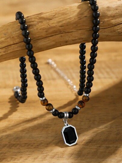 1 Pièce Collier Pendentif En Perles D’œil De Tigre Avec Pierre De Strass Carrée Noire Pour Les Hommes