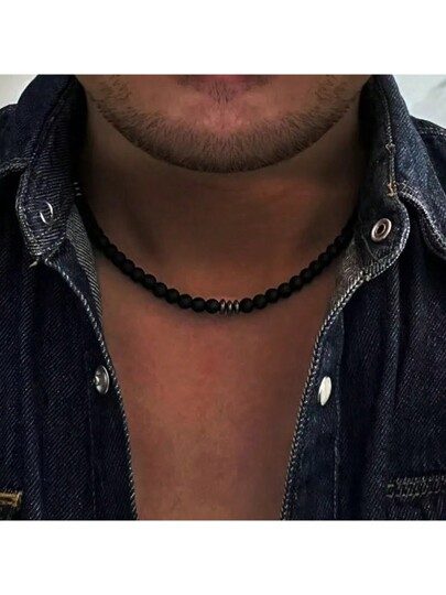 Collier Punk Classique Pour Hommes, Style Minimaliste Et Vintage, Avec Perles En Pierre Volcanique Noire Et Gypse Noir, 1 Pièce