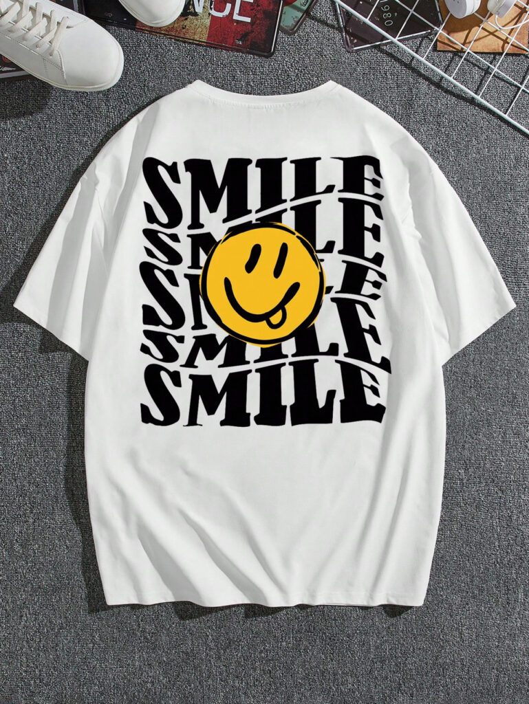 Manfinity UrbanChill T-shirt casual à col ras du cou tricoté pour homme, manches courtes, imprimé de lettres et de visages, cadeau pour petit ami