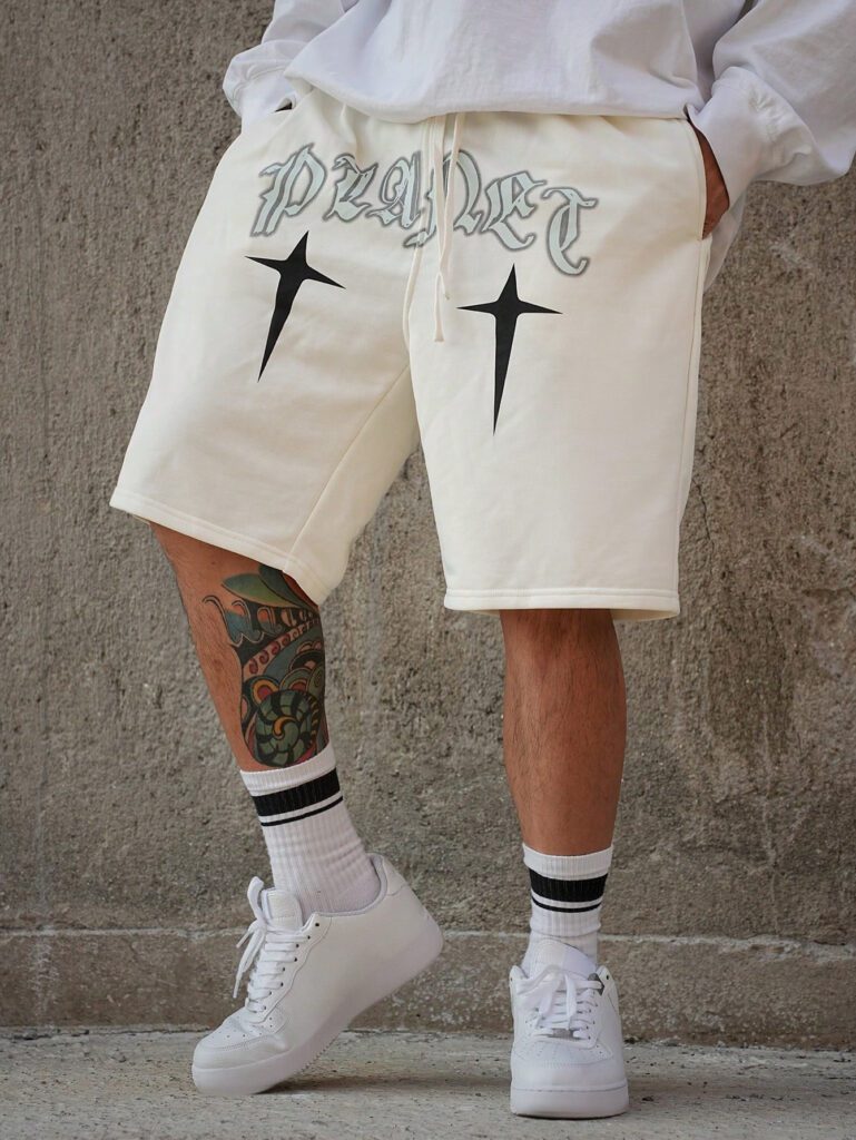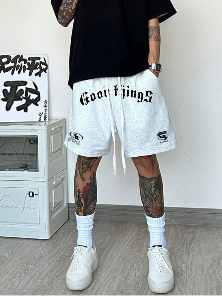 Manfinity EMRG Shorts pour hommes amples avec taille à cordon de serrage et imprimé lettre, fraîcheur de la transpiration, couleur blanche unie, urbain drôle, cadeau pour petit ami