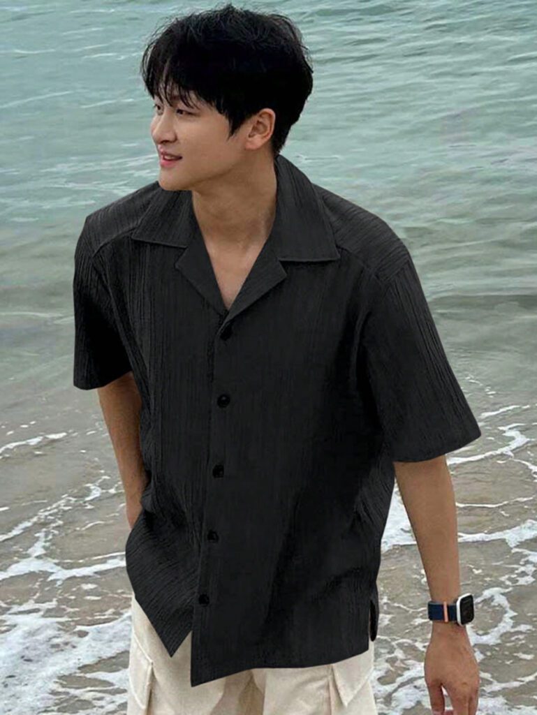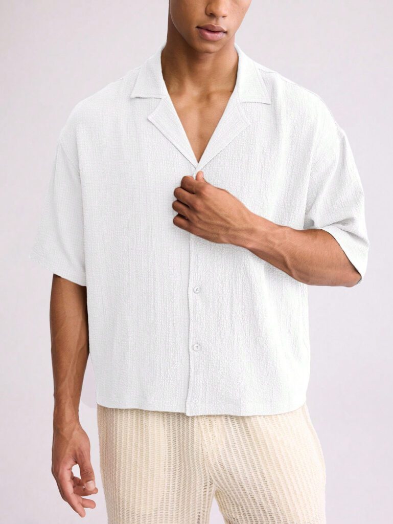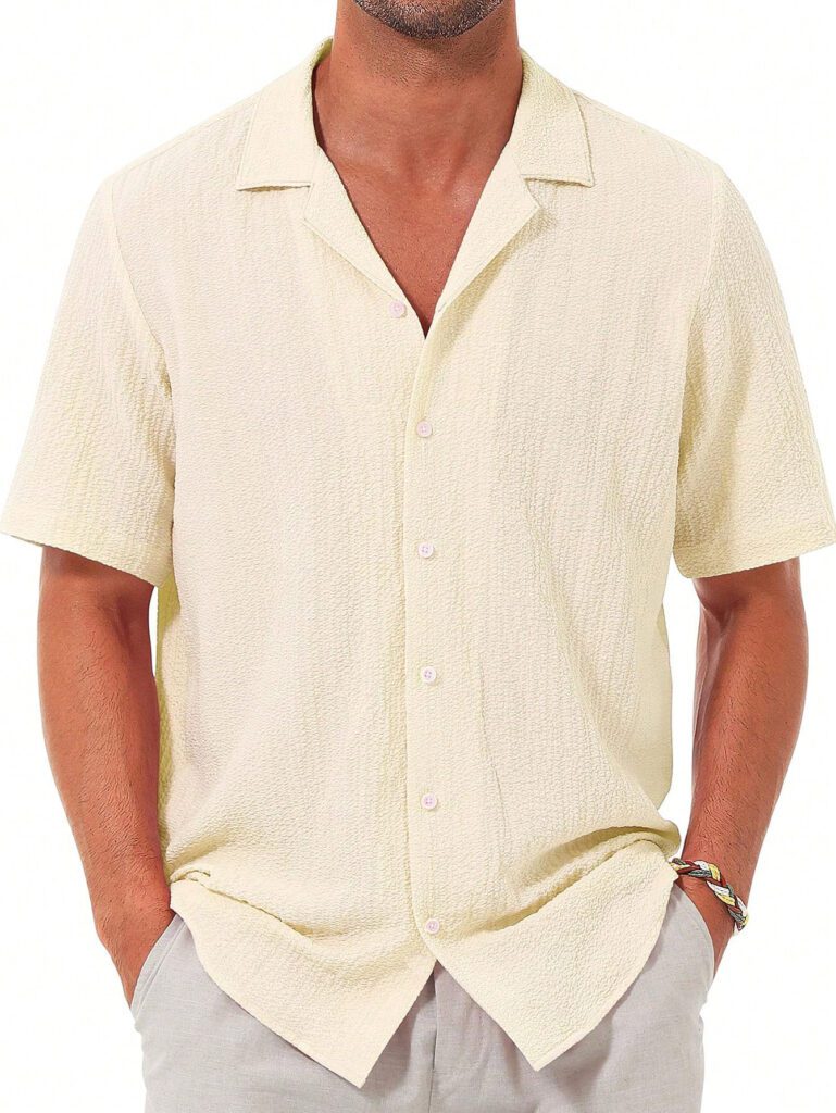 Chemise de vacances à col cubain boutonnée à manches courtes décontractée pour hommes, chemise de plage d’été avec texture