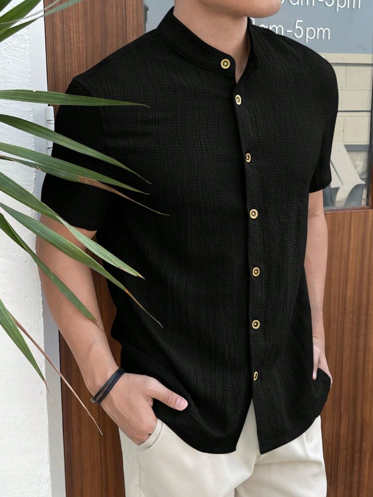 Chemise de vacances à col cubain boutonnée à manches courtes décontractée pour hommes, chemise de plage d’été avec texture